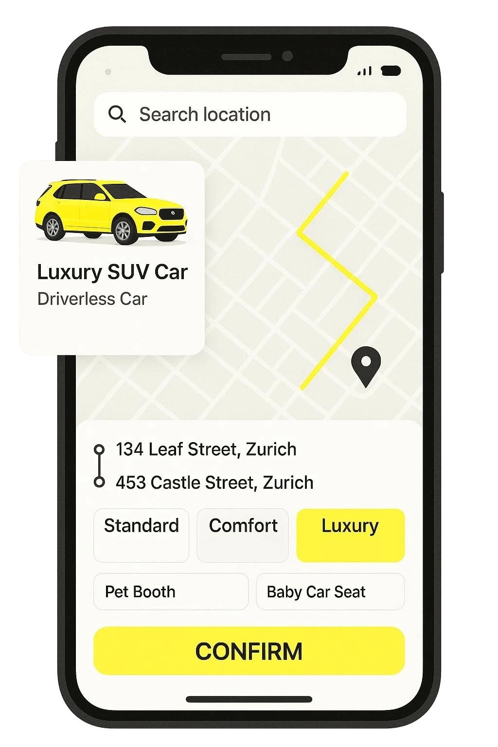 Genießen Sie ein nahtloses Online-Erlebnis, bei dem Sie Ihre Fahrt auswählen, Ihre Reise bestätigen und sofort eine Buchungsbestätigung erhalten – alles bequem von Ihrem Gerät aus.